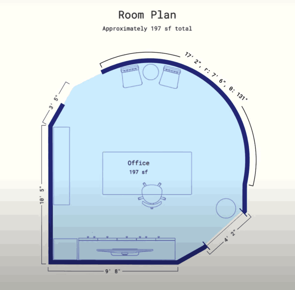 Le mode Chambre (Rm pour Room) permet le scan rapide et détaillé en quelques instants. Il mesure des murs courbés autrement compliqués à mesurer et dessiner, possède un catalogue de meubles qu’on peut intégrer grâce à la Réalité Augmentée.